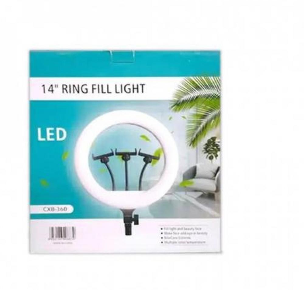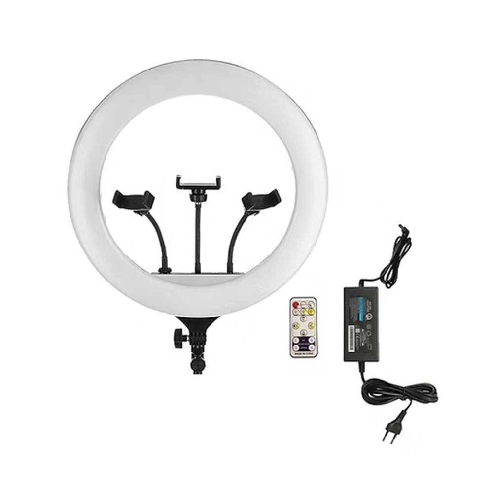 إضاءة تصوير دائرية (رينغ لايت) مزوّدة بحامل ثلاثي يمكنه تثبيت حتى 3 جوالات في نفس الوقت، مثالية للبث المباشر، تصوير المحتوى، والمكالمات.